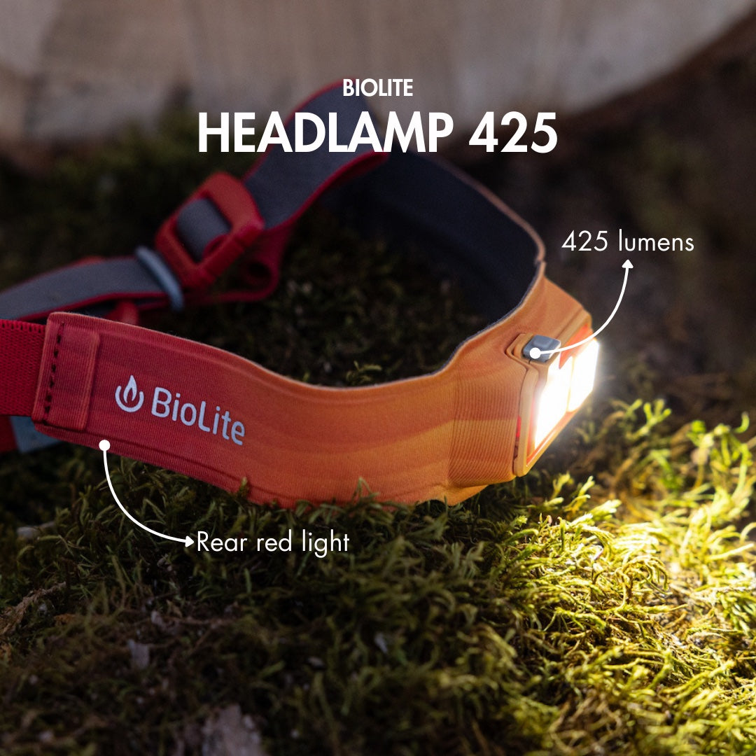 BioLite's HeadLamp 425 shines bright with 425 lumens, featuring easy one-hand tilting and a large power button for effortless operation. It includes a USB-C rechargeable rear red light for safety, ideal for camping, running, and biking.