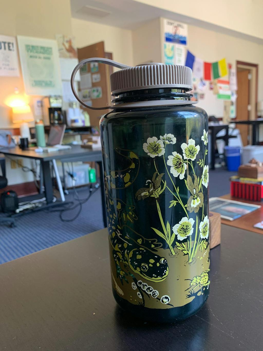 This is a 32oz Wide Mouth Nalgene Water Bottle with an original illustration "Vernal", featuring Meadowfoam Miner, Douglas' Meadowfoam, Harlequin Calicoflower, California Tiger Salamander, Conservancy Fairy Shrimp, Delta Green Ground Beetle, Yucca Moths, Mojave Yucca, and a Canyon Bat.