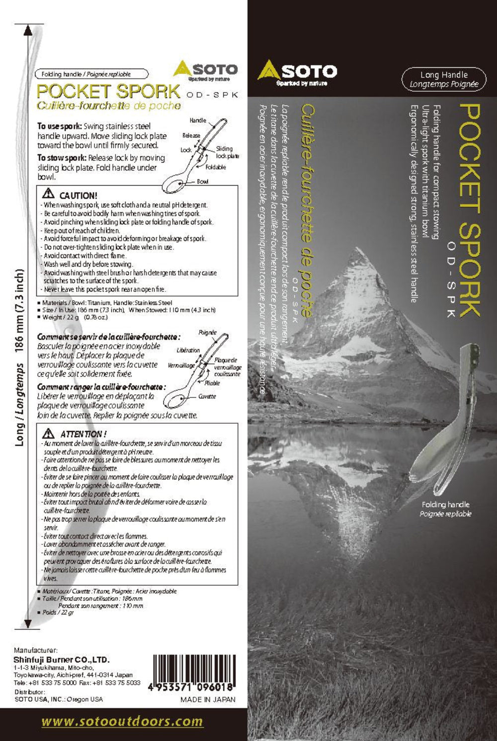 The SOTO Pocket Spork is a compact and thoughtfully crafted tool, designed for durability and ease. Made in Japan with a titanium bowl and stainless steel folding handle, it combines lightweight functionality with exceptional quality. The sleek, foldable design saves space without sacrificing utility, making it an ideal companion for minimalist cooking on the trail. Built to endure and designed with precision, the Pocket Spork is a reliable choice for those who appreciate craftsmanship and efficiency in every detail of their gear.